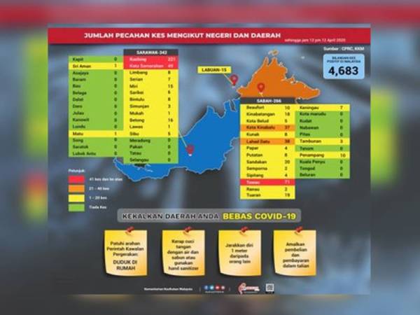 Setakat jam 12 tengah hari semalam, 4,683 kes positif direkodkan di seluruh Malaysia manakala daripada jumlah itu, 2,108 telah pulih.